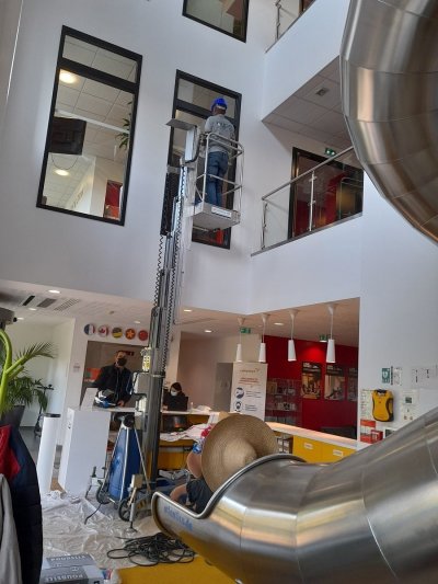 Après l’accord du client sur le devis, nous programmons le début de la prestation de nettoyage de vitre en hauteur. Pour un rendu de qualité et dans un souci de satisfaire notre client, nous avons mis en place les gros moyens pour le nettoyage en hauteur. Nous avons également apprêté des produits et un matériel professionnels.