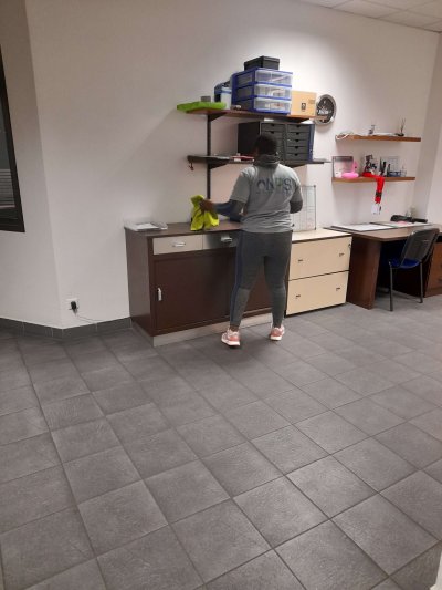 Le jour de la prestation, nous avons mis en place tous les matériels et produits nécessaires pour effectuer le nettoyage. Nous avons commencé par aérer les locaux et enlever les toiles d'araignée. Nous avons ensuite procédé au dépoussiérage et à l'essuyage humide des bureaux, de l'imprimante, du combiné téléphonique, des meubles et des poignées de portes avec un produit désinfectant. Nous avons également nettoyé les toilettes et passé l'aspirateur et la serpillière avec un produit adapté au sol. Enfin, nous avons fermé les fenêtres et terminé la prestation.